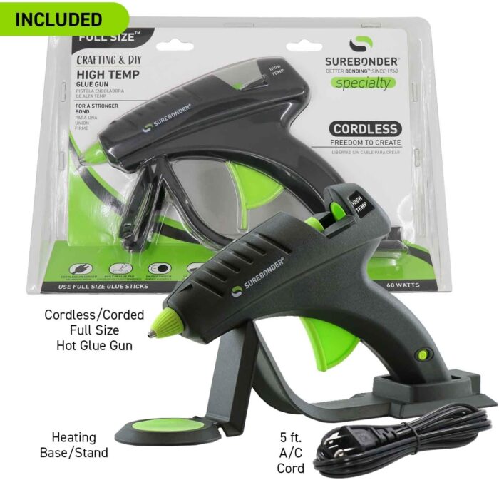 - Includes Heating Base (For Holding And Warming Glue Gun In Cordless Mode) To Hold Between Applications
